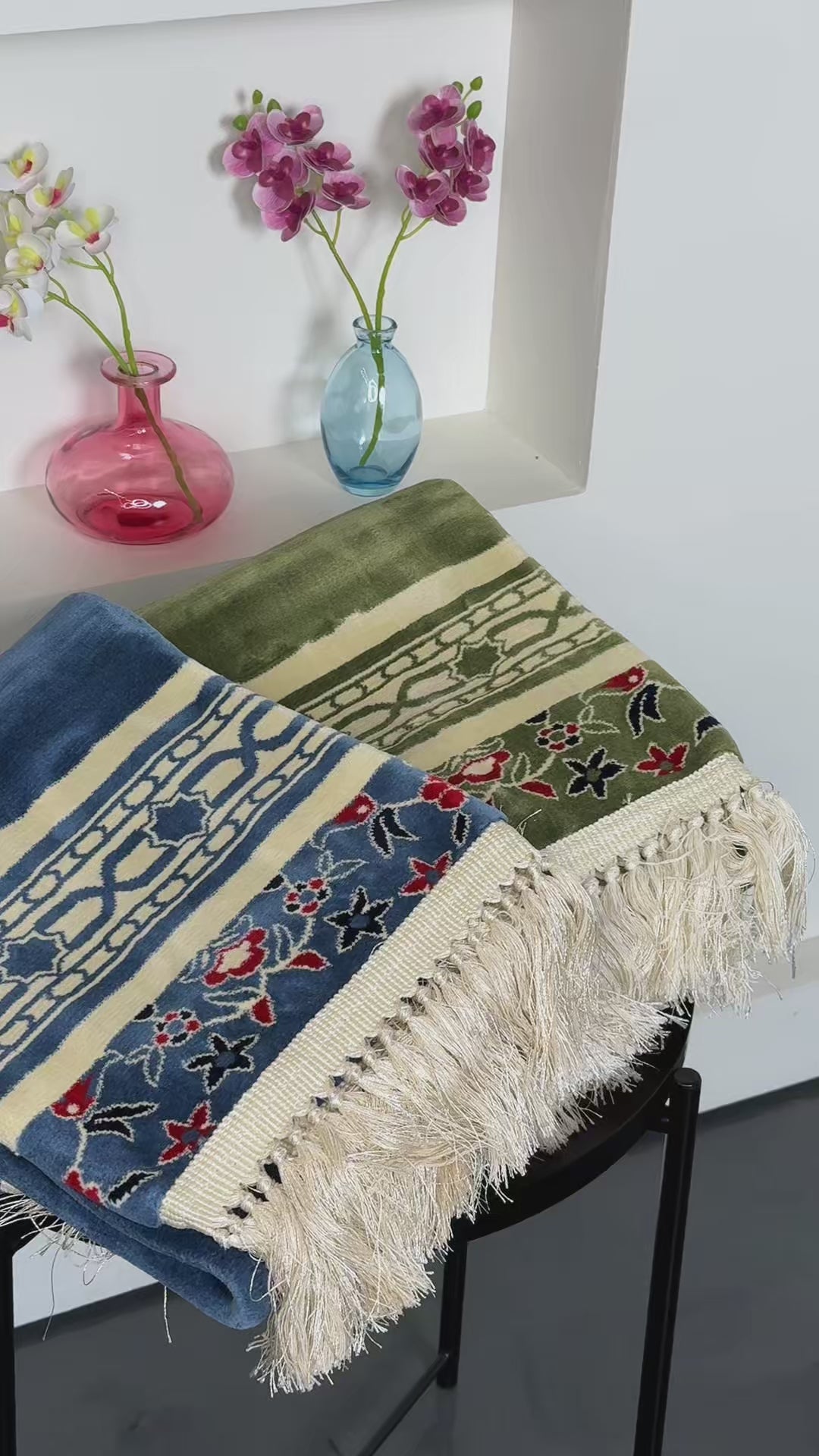 The prayer mat is made from premium velvet, embroidered along the edges and padded for comfort, offering both elegance and a soft, luxurious feel.