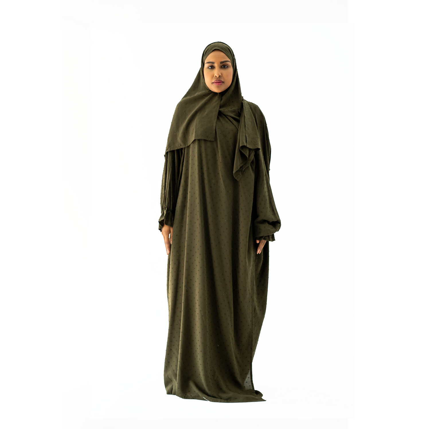 Elevate your prayer moments with Nusuki’s Dotted Prayer Dress, designed with a loose, flowing cut that ensures full coverage and ease of movement.
