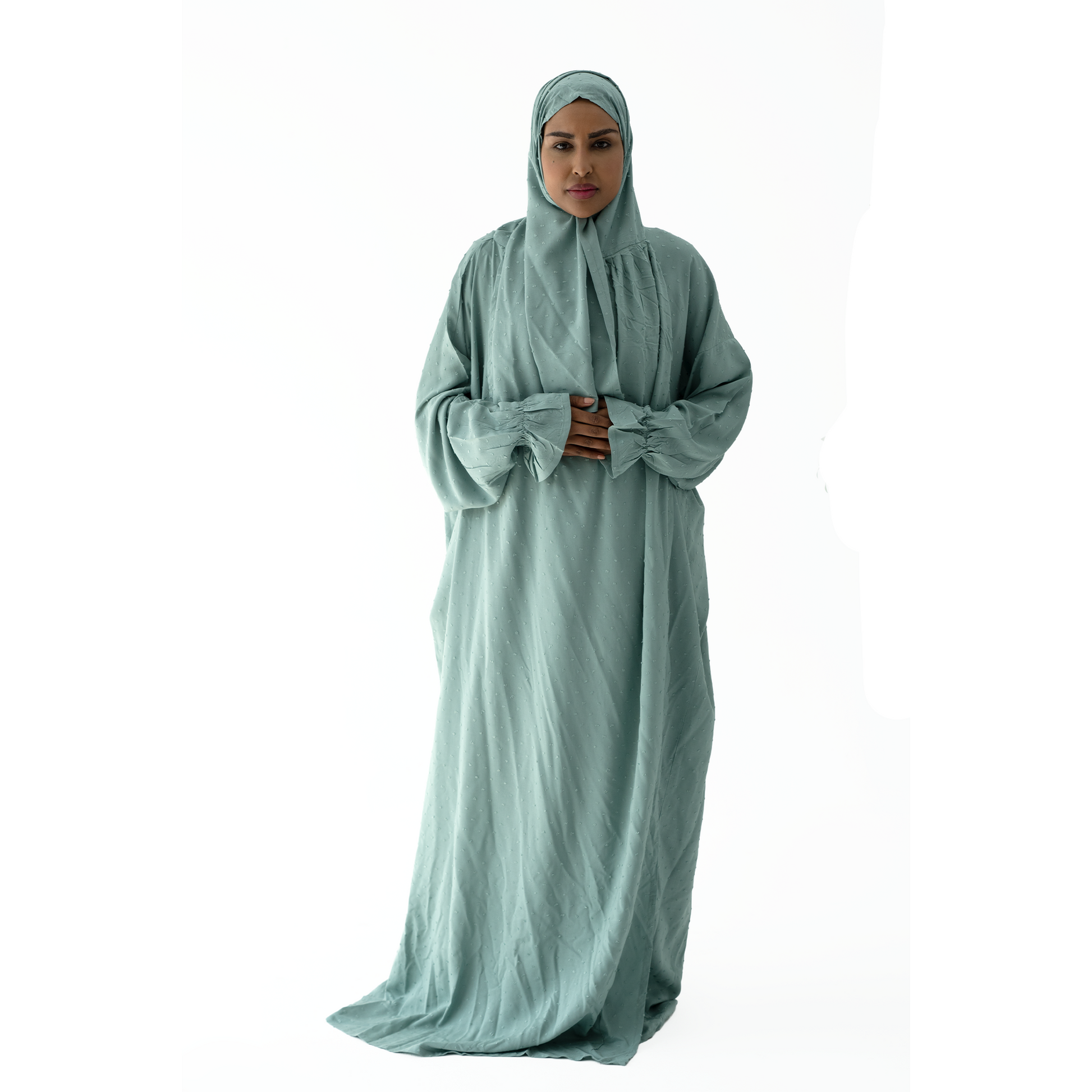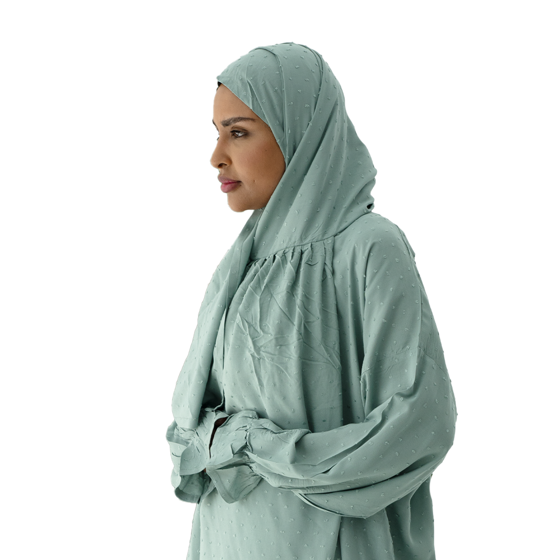 Elevate your prayer moments with Nusuki’s Dotted Prayer Dress, designed with a loose, flowing cut that ensures full coverage and ease of movement.