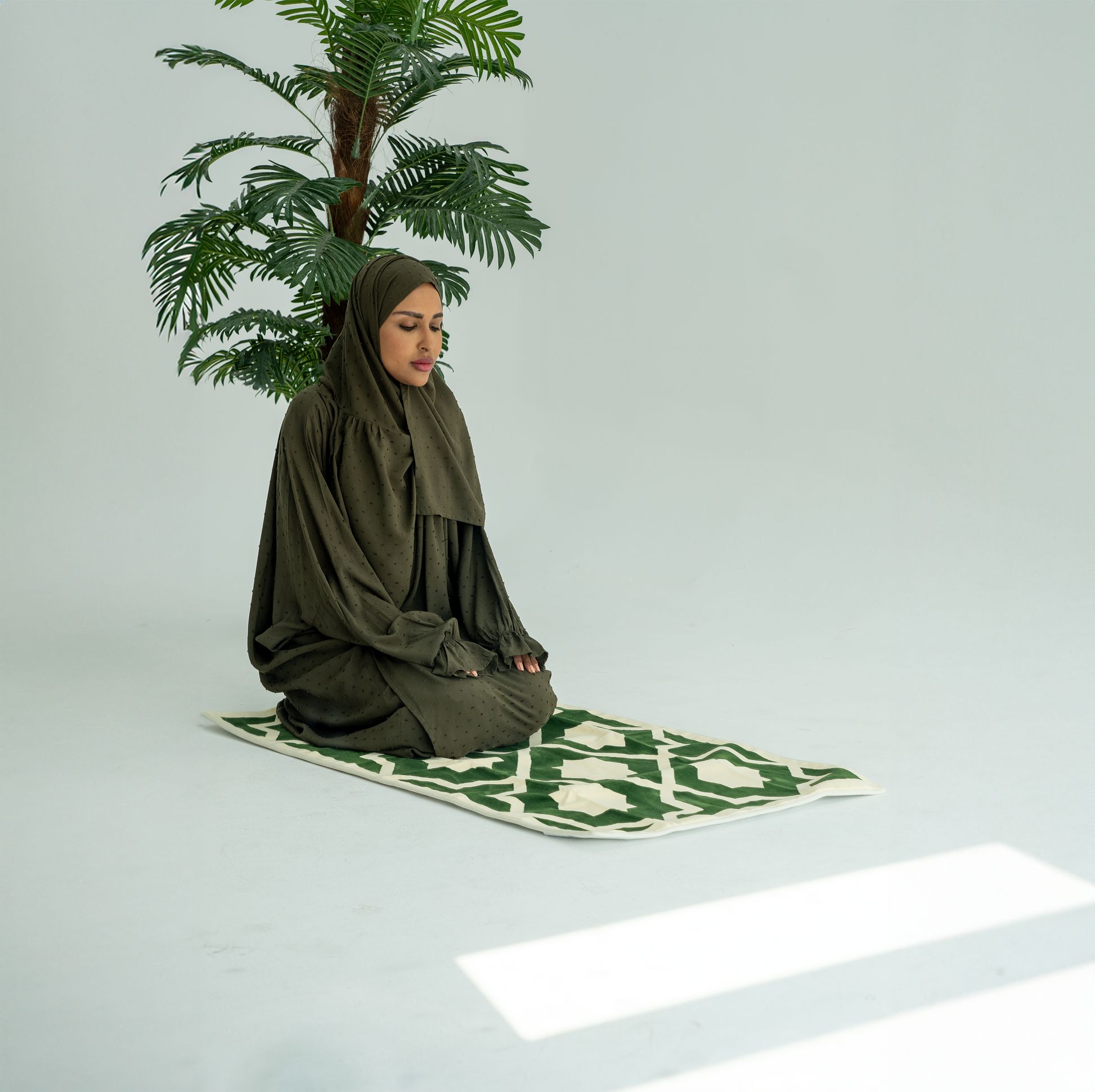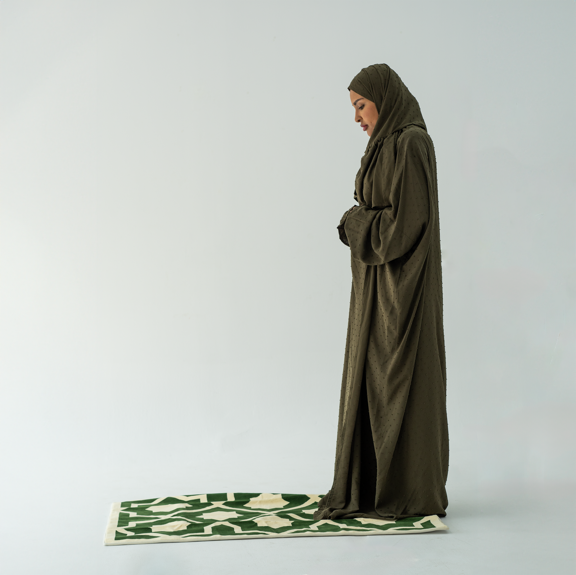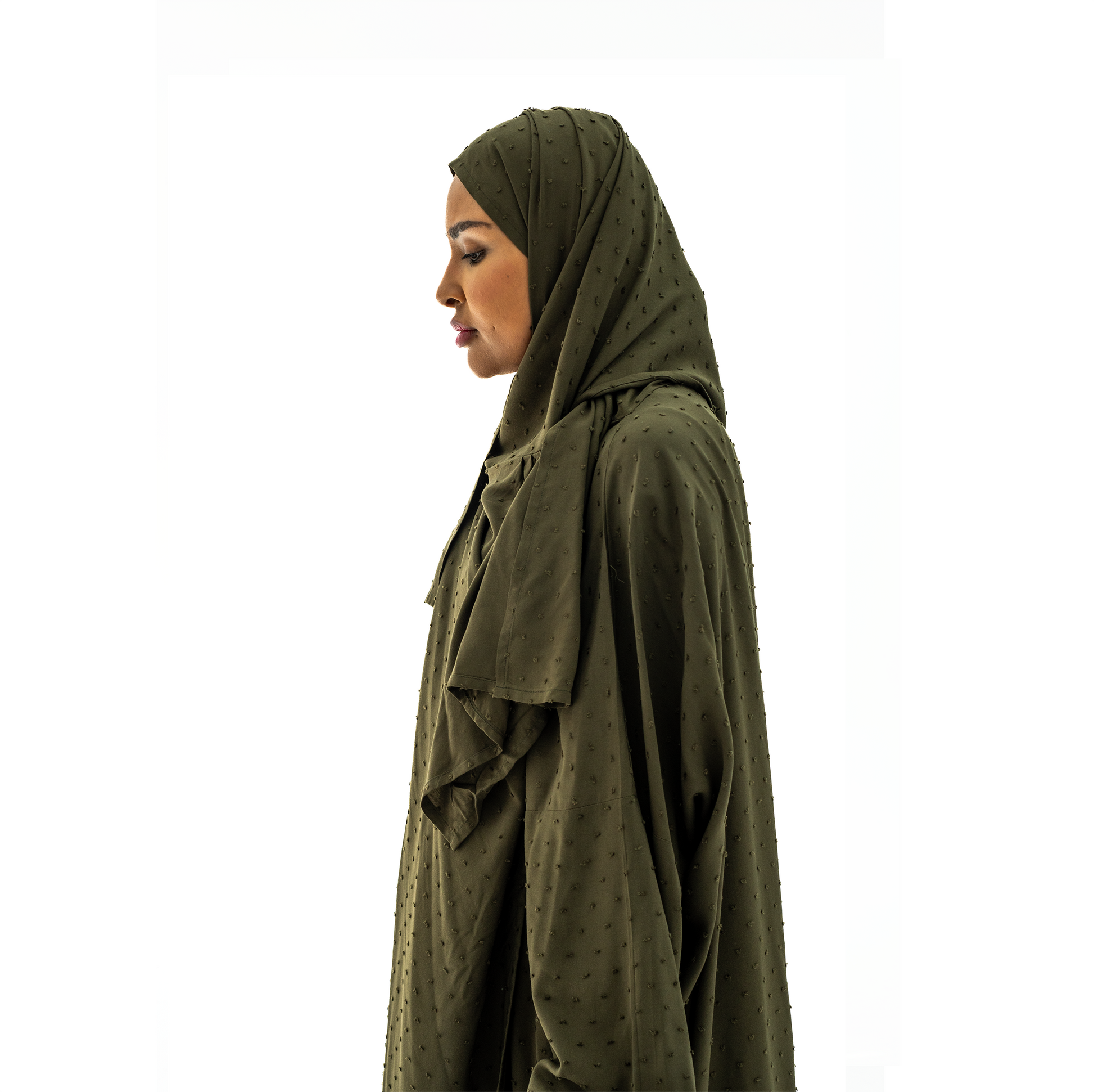 Embrace comfort and elegance in your worship with the Dotted Prayer Dress in Dark Olive by Nusuki.
