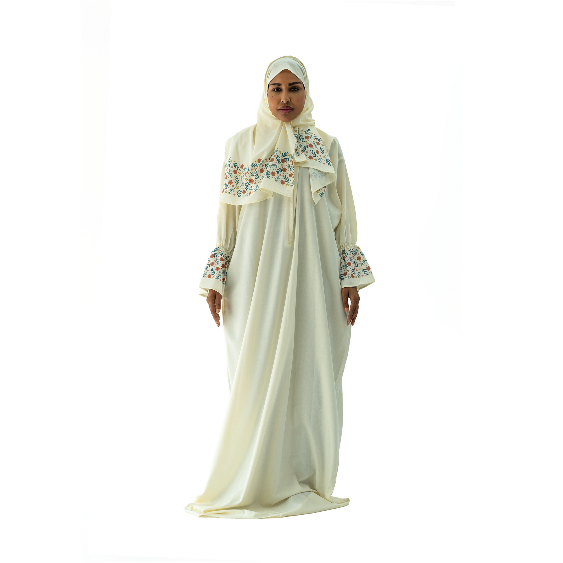 Nusuki’s Printed Prayer Dress blends refined design and elegant prints with soft cotton fabric that keeps you feeling fresh and serene. One-size fit offers full coverage with a length of 170 cm, highlighted by tasteful print details on the cuffs and scarf that add decorative elegance without sacrificing modesty and devotion.