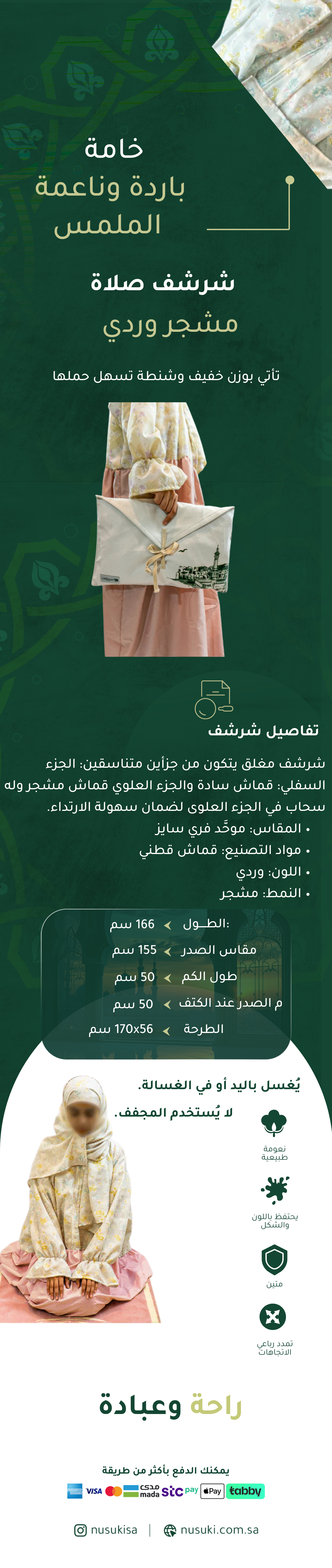 شرشف مغلق يتكون من جزأين متناسقين: الجزء السفلي: قماش سادة والجزء العلوي قماش مشجر وله سحاب في الجزء العلوى لضمان سهولة الارتداء.