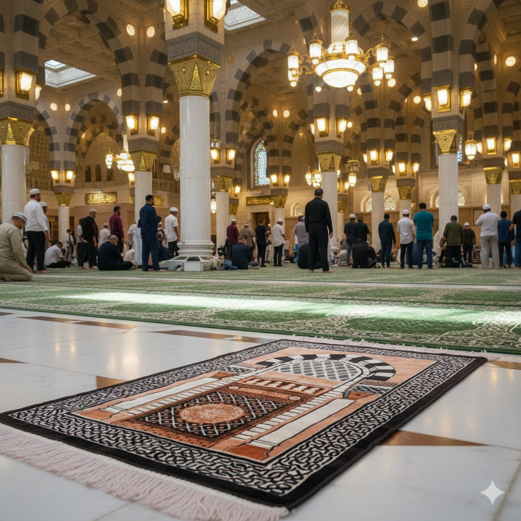 تُصنع في مصنع منوال بالمدينة المنورة باستخدام أفضل الخيوط والتقنيات المتخصصة في صناعة السجاد والإحرامات.
