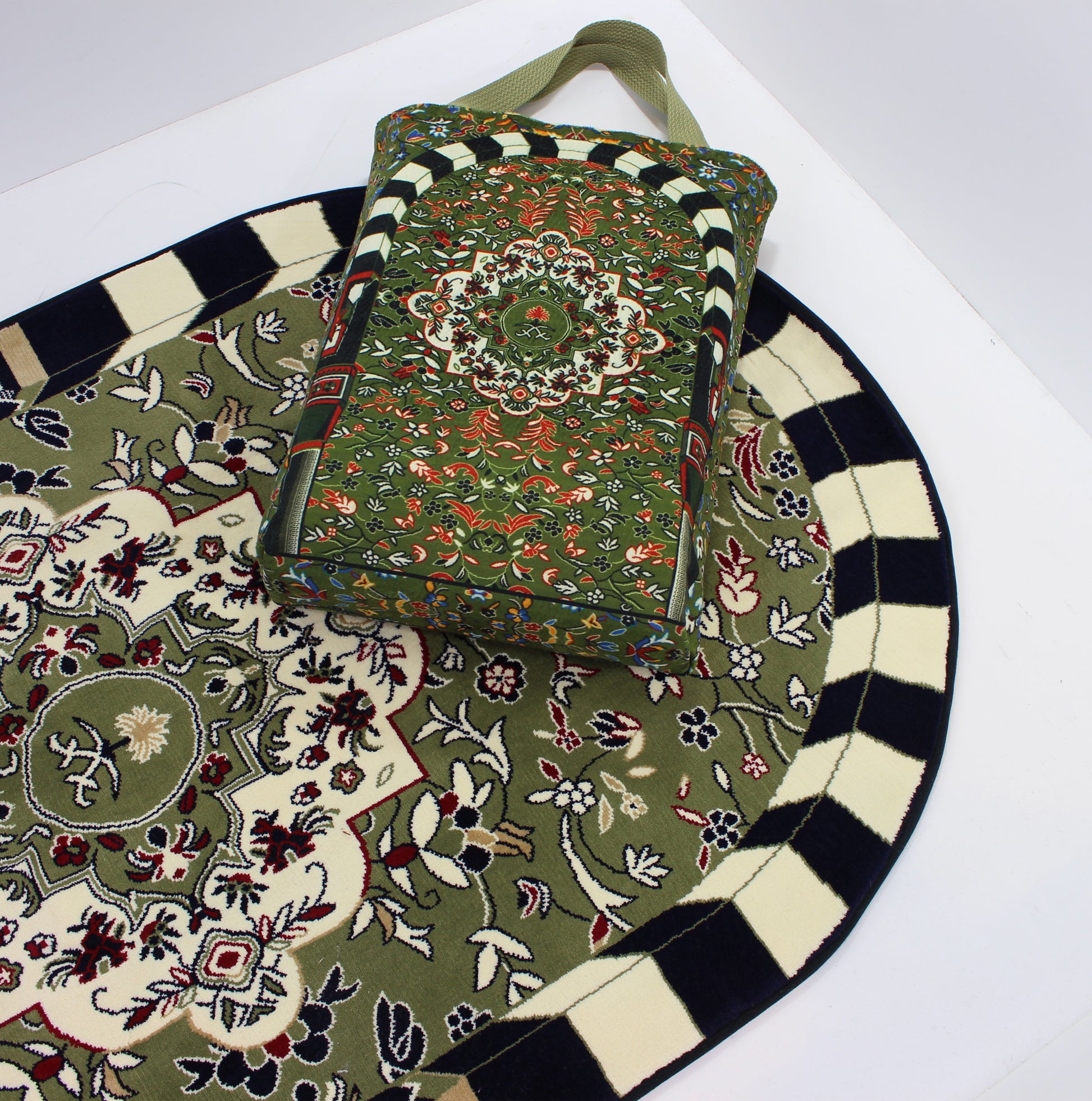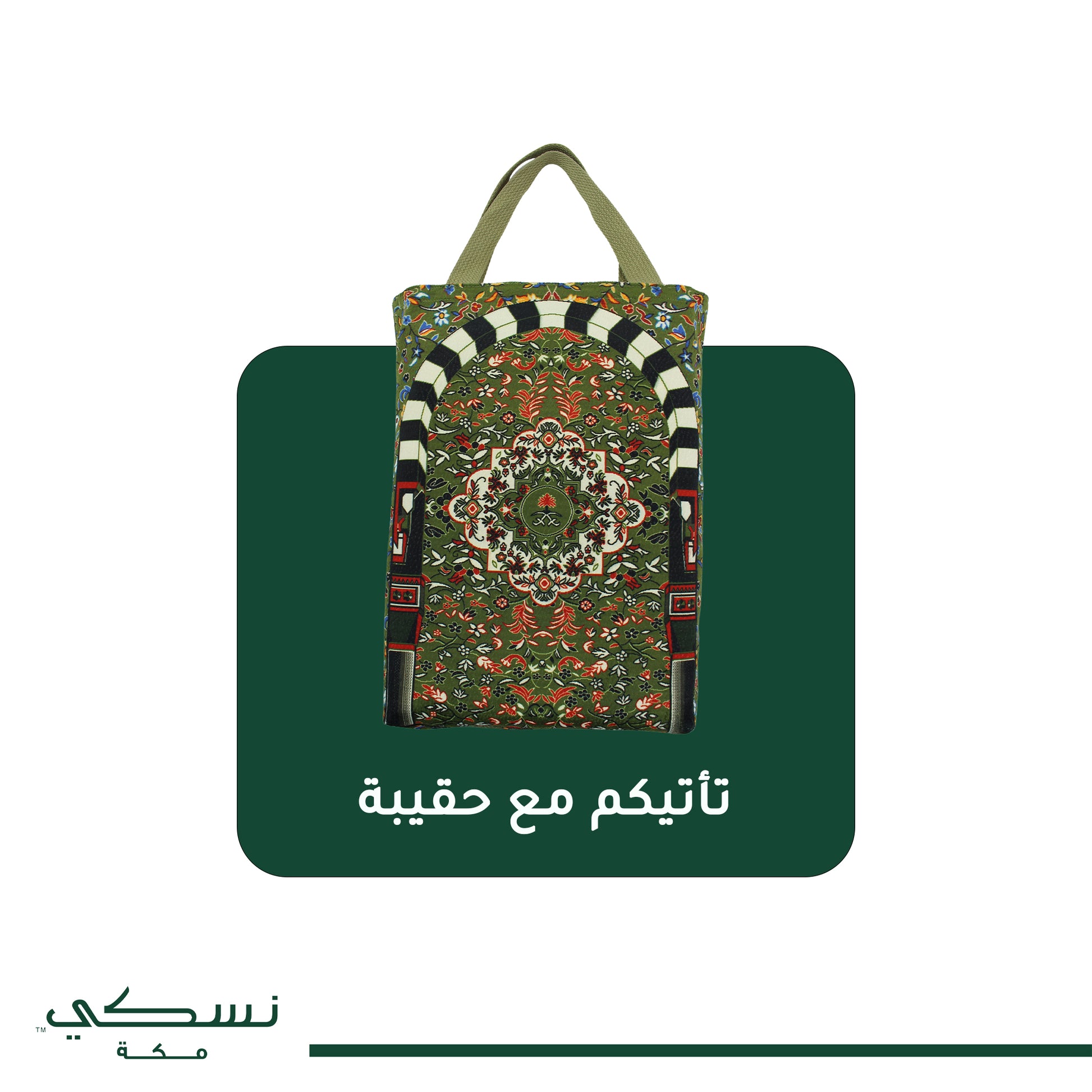 السجادة تأتي مع حقيبة أنيقة مطابقة للتصميم، مصنوعة بعناية لتضفي لمسة فخامة إضافية. الحقيبة عملية وخفيفة الوزن، تسهّل عليك حمل السجادة إلى المسجد أو أثناء السفر، كما تحافظ على نظافتها وجودتها لفترة طويلة. بفضل مقبضها المريح وتصميمها العصري، تصبح الحقيبة جزءًا جميلاً من هديتك أو استخدامك اليومي.