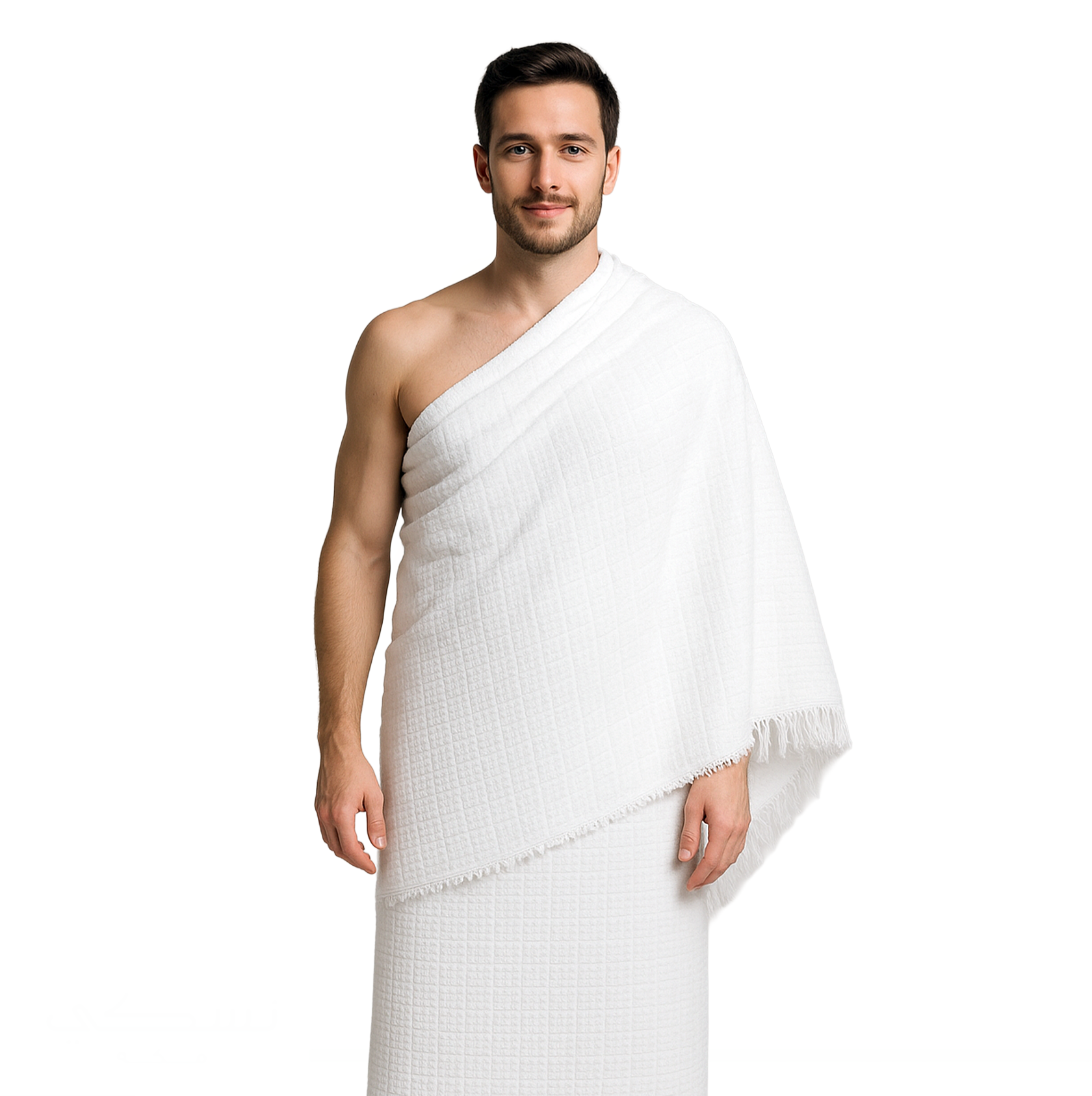 لباس إحرام اقتصادي، مصنوع من قماش أبيض مريح وبأعلى جودة مقابل سعره. نحافظ في هذا المنتج على نفس مستوى الجودة والإتقان. يحتوي المنتج على قطعتين من الإحرام (المنشفة).