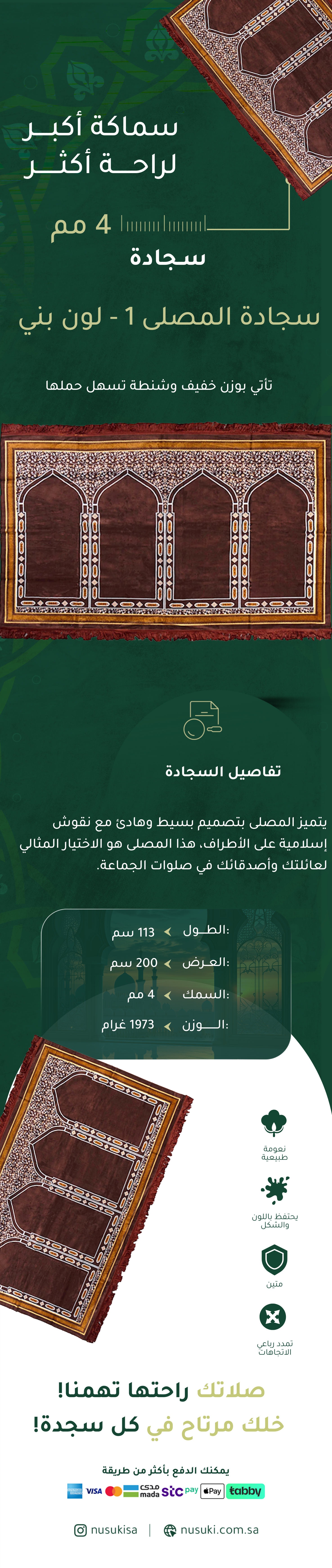 يتميز المصلى بتصميم بسيط وهادئ مع نقوش إسلامية على الأطراف، هذا المصلى هو الاختيار المثالي لعائلتك وأصدقائك في صلوات الجماعة.