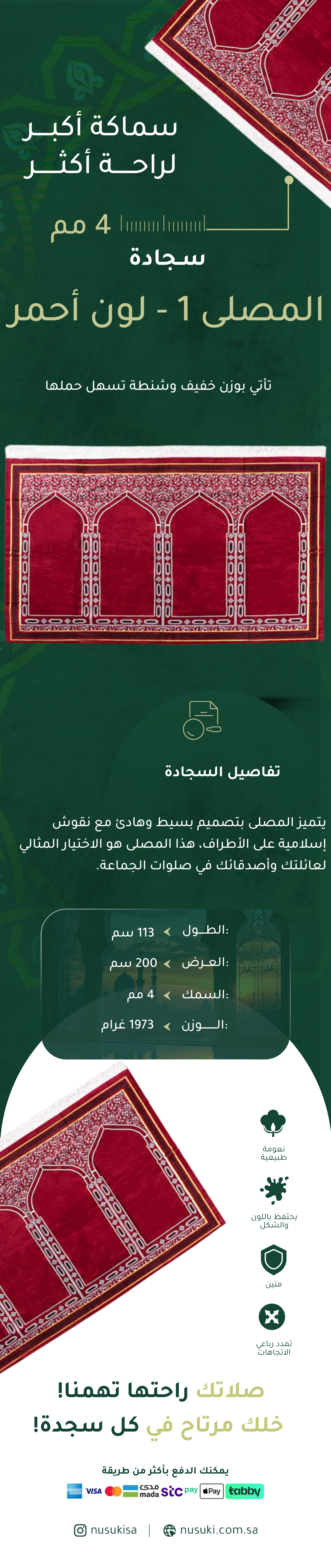 يتميز المصلى بتصميم بسيط وهادئ مع نقوش إسلامية على الأطراف، هذا المصلى هو الاختيار المثالي لعائلتك وأصدقائك في صلوات الجماعة.