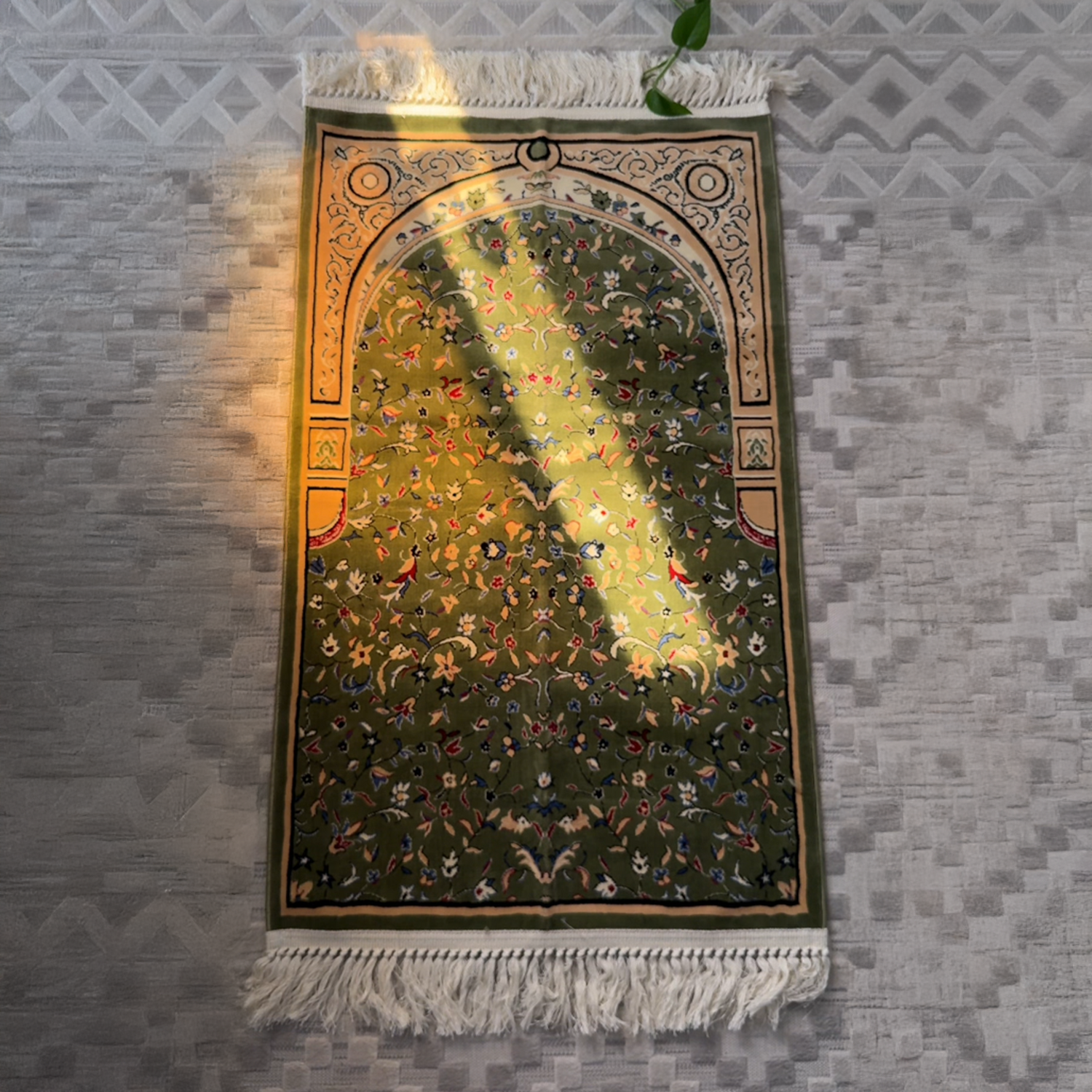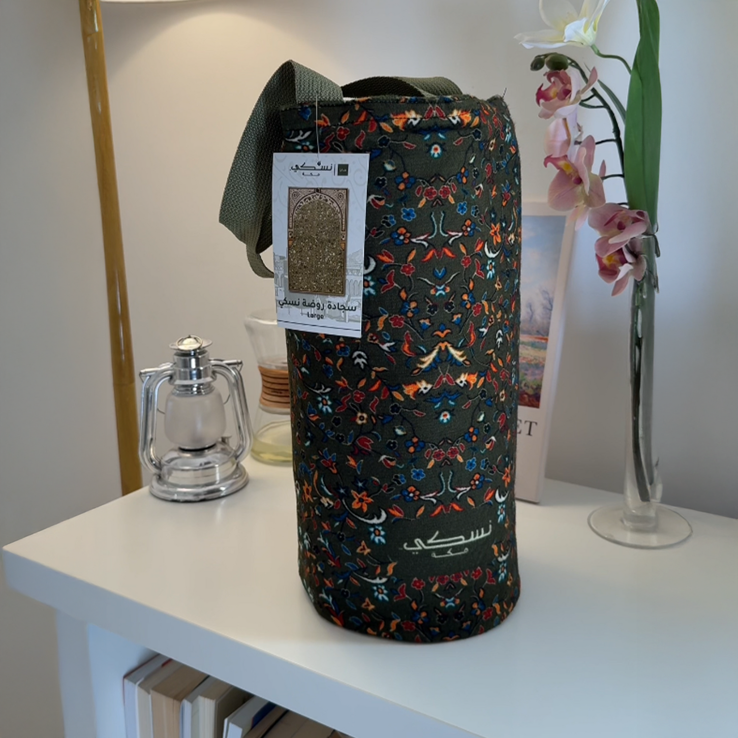 سجادة مستوحاة من نقوش الروضة الشريفة تمنحك أناقة هادئة وراحة ملموسة في كل سجدة، مع حقيبة مطابقة للتصميم لسهولة الحمل والحفظ، مثالية للاستخدام اليومي أو كهدية راقية.