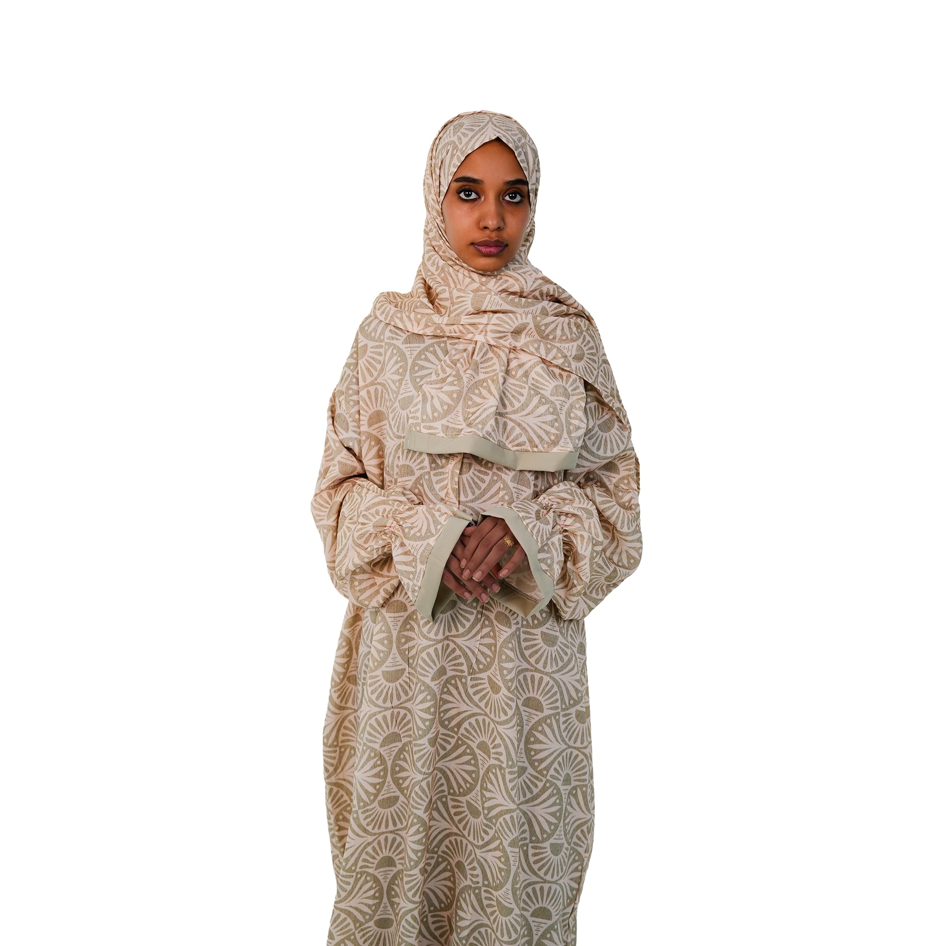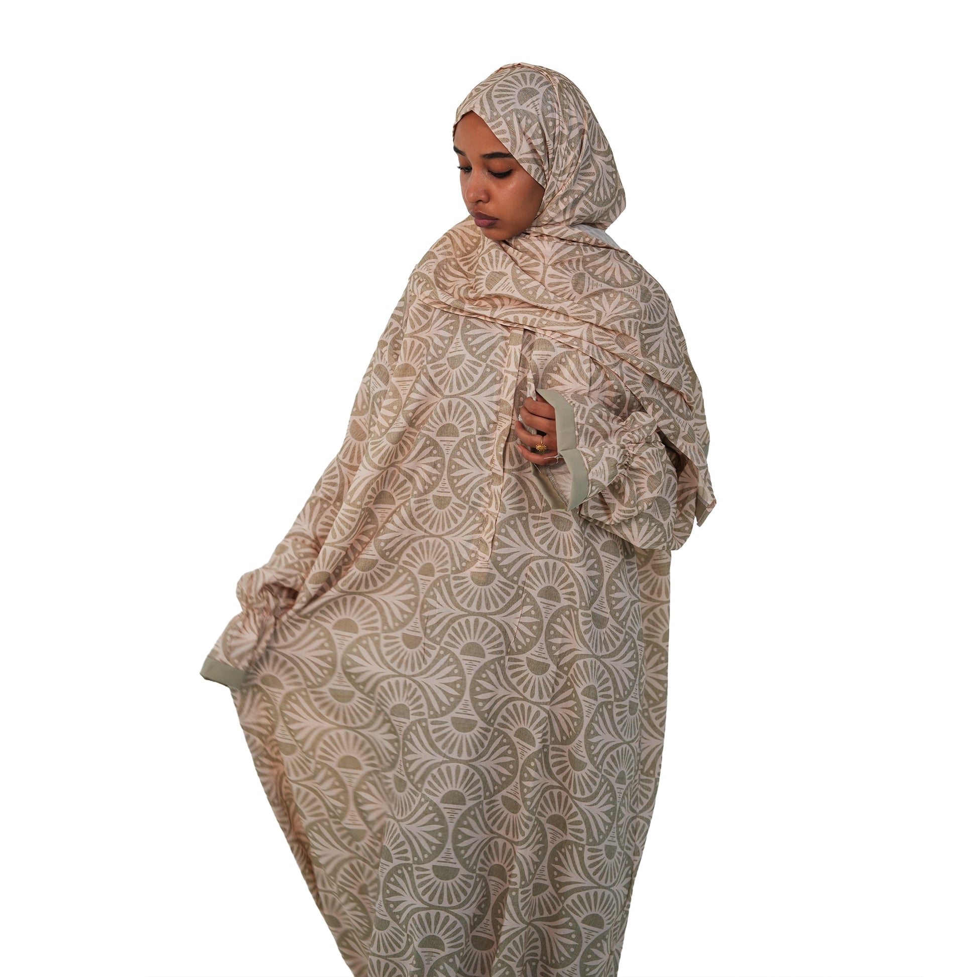 التصميم: قصة واسعة ساترة مع طرحة رأس متصلة، مزينة بنقوش الهندسية التي تحاكي الطبيعة بأسلوب عصري.