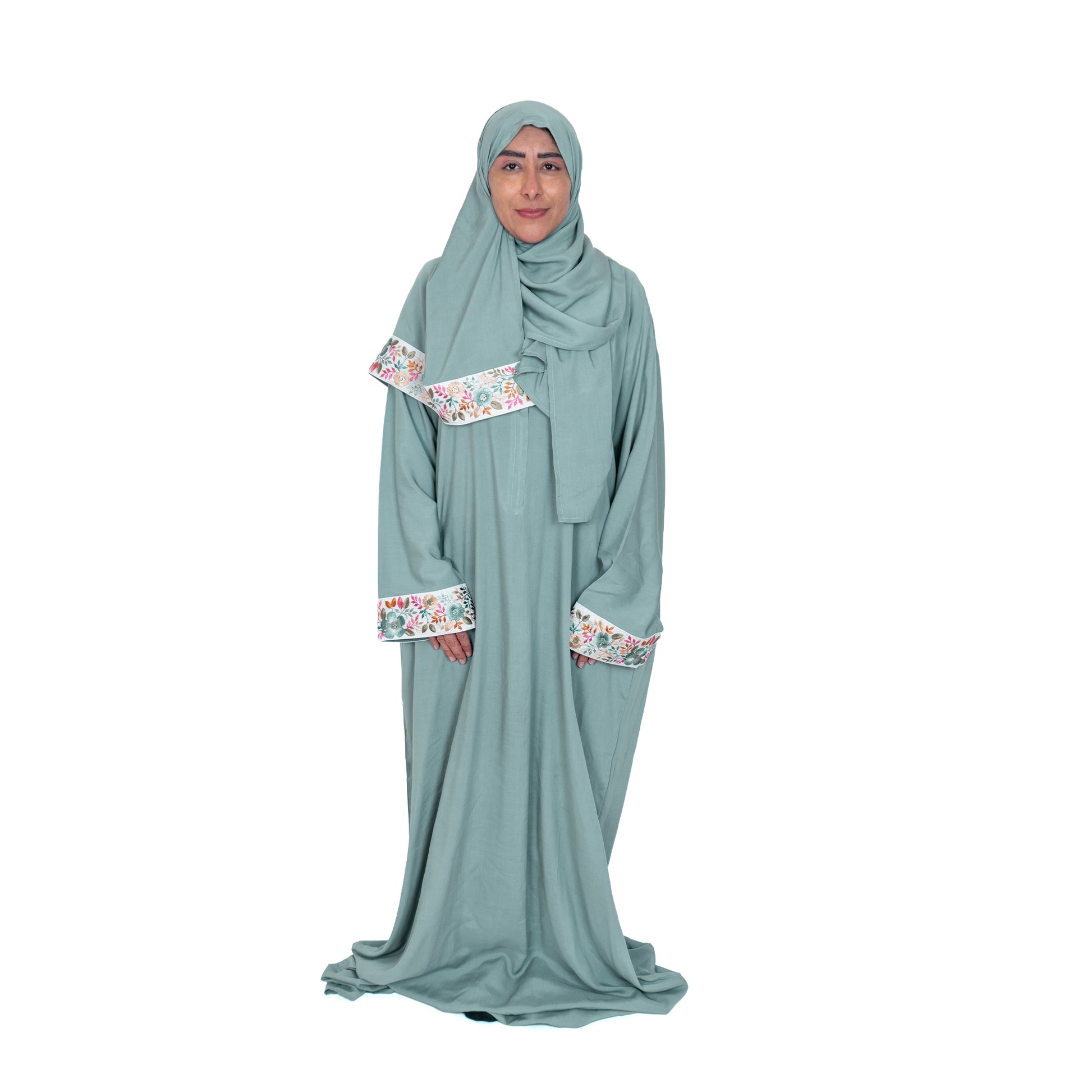 استمتعي بصفاء اللحظة مع شرشف تسنيم الفاخر. يتميز هذا الشرشف بلونه الهادئ الذي يريح البصر، مع شريط تطريز مورّد بدقة عالية يزين الصدر والأطراف، مضفياً لمسة أنثوية راقية. صُمم في مصنع منوال بالمدينة المنورة من قماش بارد ينسدل بنعومة، ليمنحكِ شعوراً بالخفة والسكينة أثناء الصلاة.